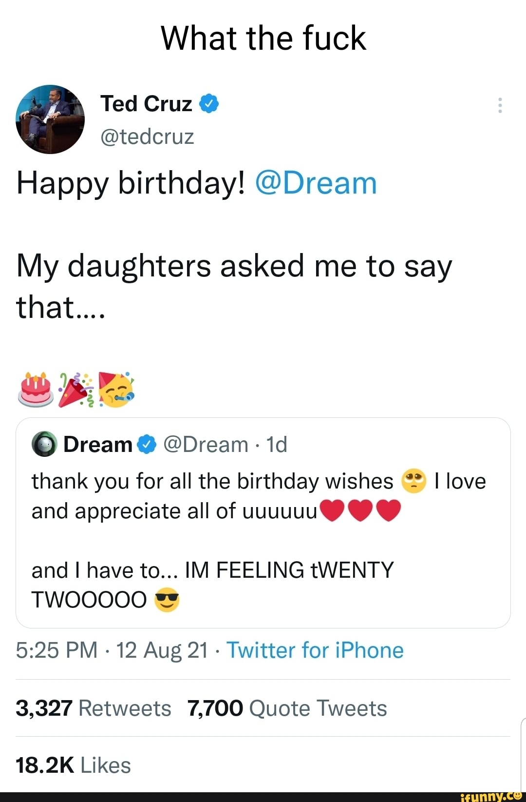 IM FEELING tWENTY TWOOOOO PM - Aug 12 2021 - Twitter for iPhone. Cringe shitposting bruh minecraft dream ted happy birthday daughters asked say aug. Ted Cruz wished Dream a happy birthday.
