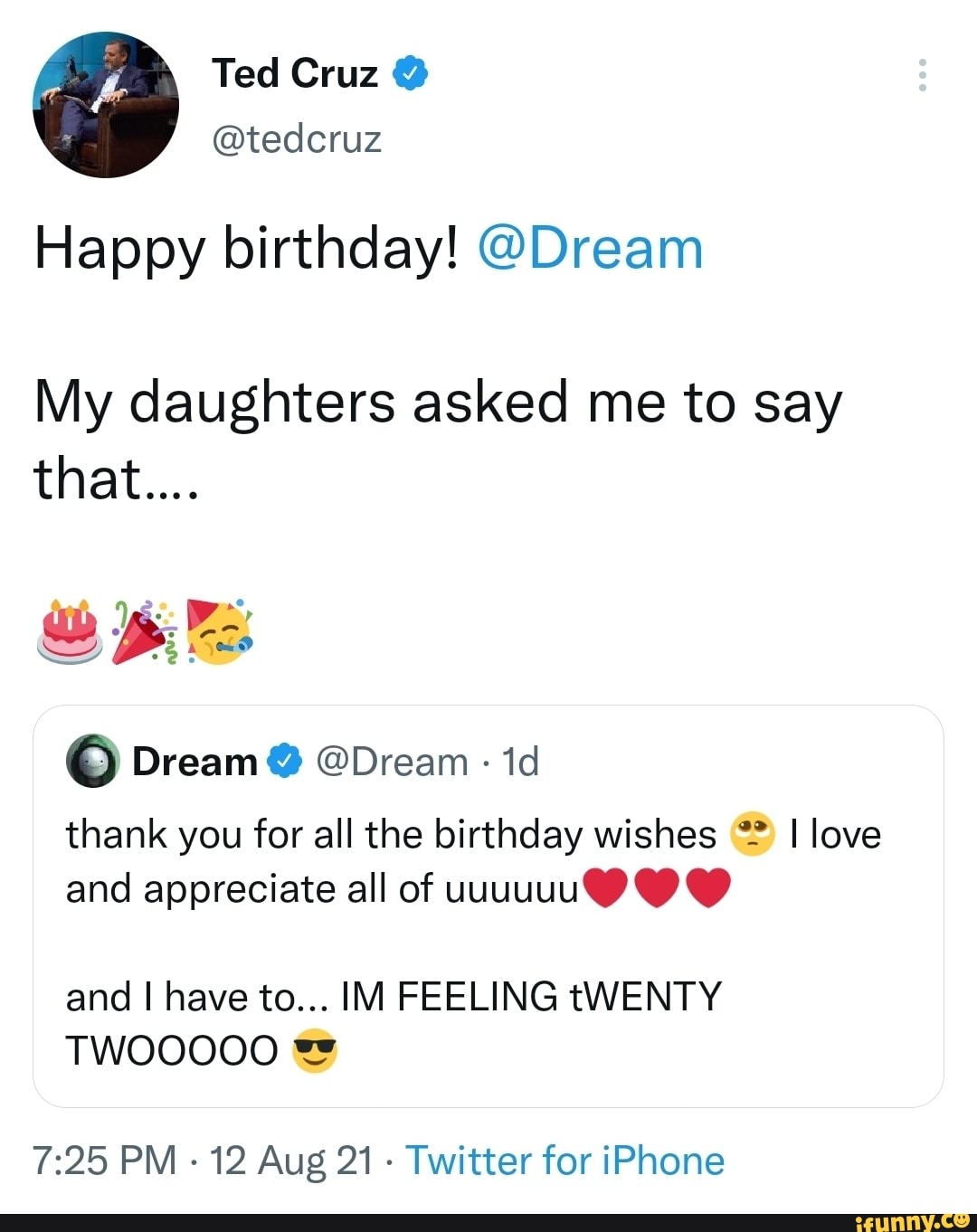 Ted cruz happy birthday dream. Twitch streamer Hasan Piker was shocked when he pulled up a tweet on stream of US Senator from Texas Ted Cruz wishing Dream a Happy Birthday. Ted Cruz wishing happy birthday to Dream REAL 417 comments. Here are the details on Obamas massive birthday celebration which he thoughtfully scaled back from a 700 person extravaganza to a smaller event with all his celebrity friends.